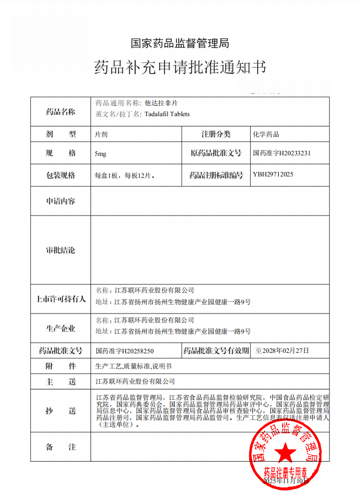 喜讯!纽约国际官网他达拉非片取得药品补充申请批件